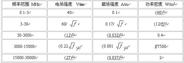 2.2.4 對(duì)于脈沖電磁波,除滿足上述要求外,其瞬時(shí)峰值不得超過表中1、2所列限值的1000 倍。